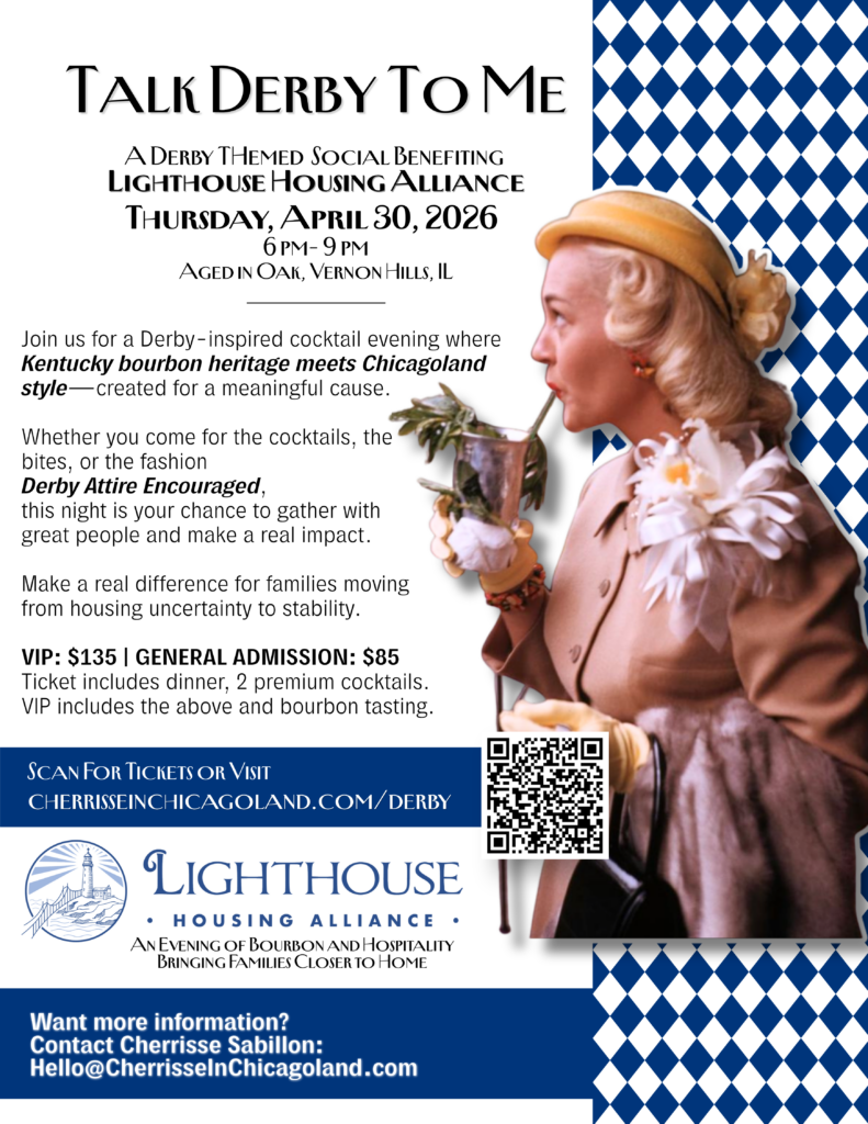 Talk Derby to Me is Cherrisse in Chicagoland’s inaugural signature fundraiser: an intimate, cocktail-style evening where Kentucky bourbon heritage meets refined Chicagoland suburban polish. Hosted at Aged in Oak and benefiting Lighthouse Housing Alliance, the night is designed for connection, storytelling, and generosity.